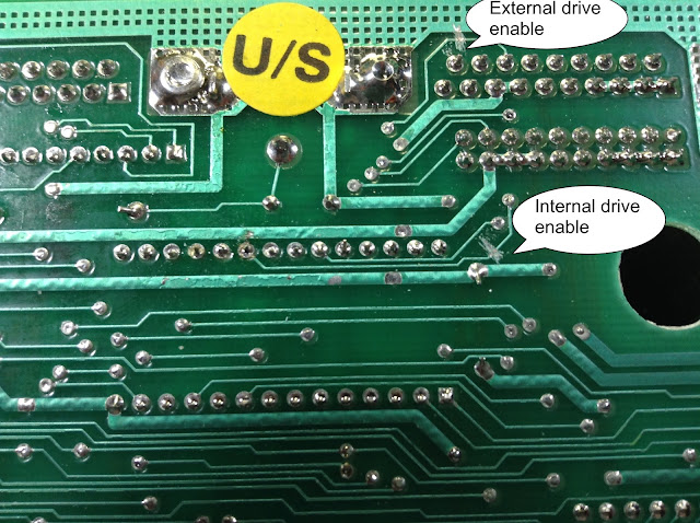 The least painful way I could figure out how to do this mod was to cut the drive enable traces on the motherboard. The drive 1 enable lines for the internal drive and DB-19 are cut.