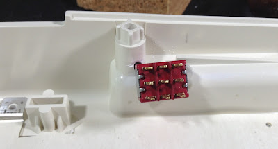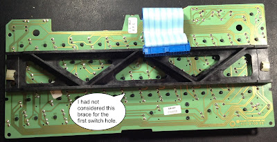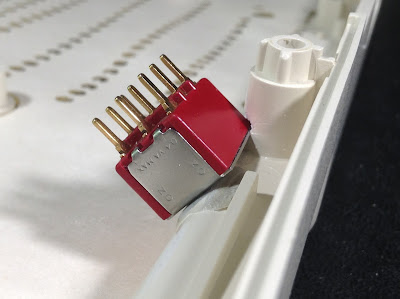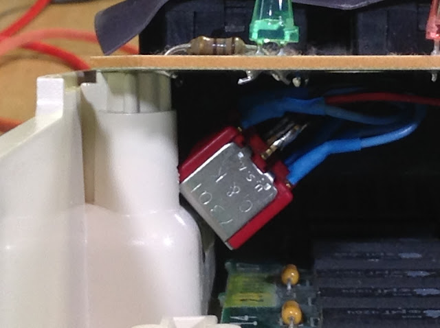 Since I didn't trim the switch contacts, I bent them. The blue wires are the jumpers between the top and bottom contacts.