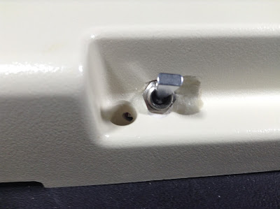 Having a //c carry case, I stole an idea from the volume control knob: the area under the side of the keyboard. The left side with the volume knob and headphone jack is already crowded so I drilled a hole on the right side.