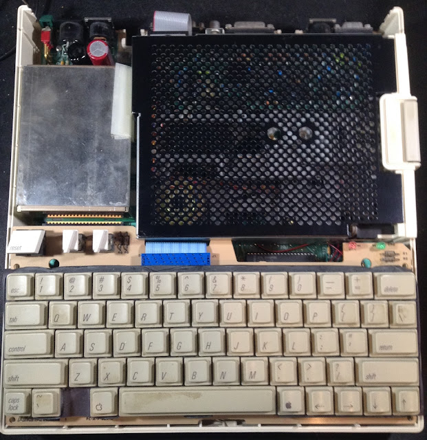 - The keyboard has a short ribbon cable connecting it to the motherboard. Move the keyboard straight away from the disk drive only enough for it to be clear of the drive. Rotate the spacebar end of the keyboard up. Disconnect the keyboard's ribbon cable from the motherboard and set the keyboard aside.